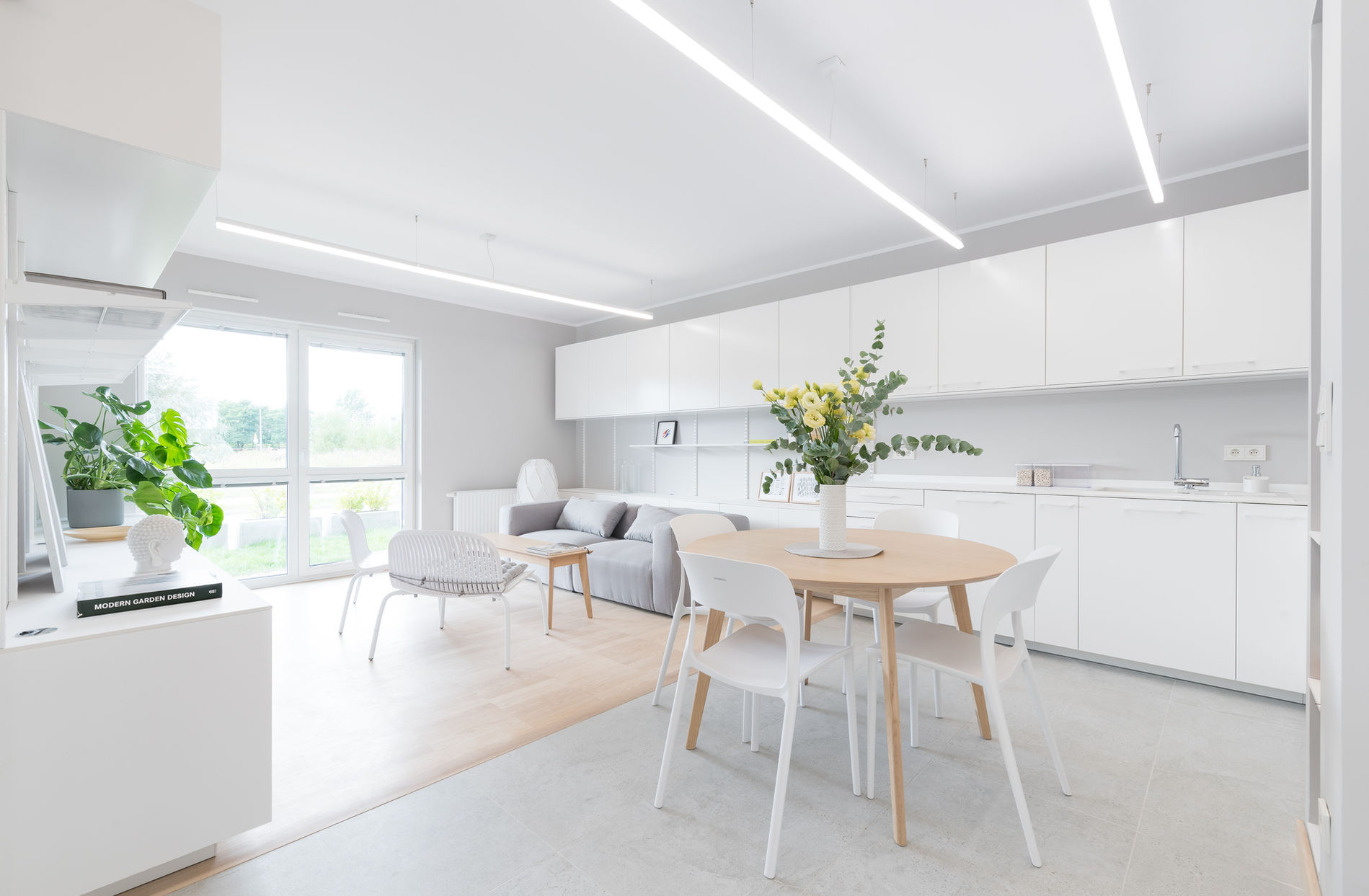 Minimalistyczny wystrój apartamentu mieszkalnego w Poznaniu. Projekt zakładał wykorzystanie jak najmniejszej ilości faktur, kolorów oraz wyposażenia. Pomimo to powstało wnętrze wygodne i przyjazne do mieszkania. Urozmaiceniem kolorystycznym na tle szarobiałych ścian i mebli są soczyste liście monstery oraz delikatny beż naturalnego drewna jesionowego. Niewielki przedpokój został optycznie powiększony ścianą luster z ukrytymi drzwiami do łazienki. W łazience przewidziano wygodną, otwartą kabinę prysznicową szafli z umywalką podblatową oraz wiszącą miskę ustępową. Charakterystycznym elementem wystroju jest okrągłe lustro w jesionowej ramie. Na uwagę zasługują techniczne wspornikowe półki z metalowej kratki. Dają one możliwość dowolnego kształtowania otwartej przestrzeni magazynowej między wiszącymi szafkami. Półki można dowolnie przestawiać i uzupełniać innymi systemowymi elementami wyposażenia. zdjęcia realizacji : Przemysław Turlej.