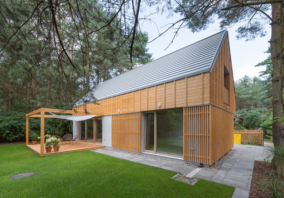 Strefa wejściowa przed budynkiem posiada zadaszenie w formie nawisu poddasza. "Wyrwany" fragment bryły tworzy funkcjonalny podcień oraz umożliwia wygodniejszy wjazd samochodu na utwardzone miejsce postojowe przed domem. Zwarta bryła domu została udekorowana dwoma drewnianymi pergolami. Frontowa rama obejmuje koronę czeremchy amerykańskiej. Docelowo może ona stanowić podstawę do wykonania zadaszenia wiaty garażowej. Druga rama powstała w obrysie drewnianego tarasu od strony pokoju dziennego. Wytwarza się w ten sposób dodatkowy pokój zewnętrzny w obrysie tarasu. Jest to strefa buforowa między światem ogrodu a intymną strefą mieszkania. Sam ogród dzięki nasadzeniom krzewów, pnączy i traw w granicach działki jest również dość intymnym miejscem.