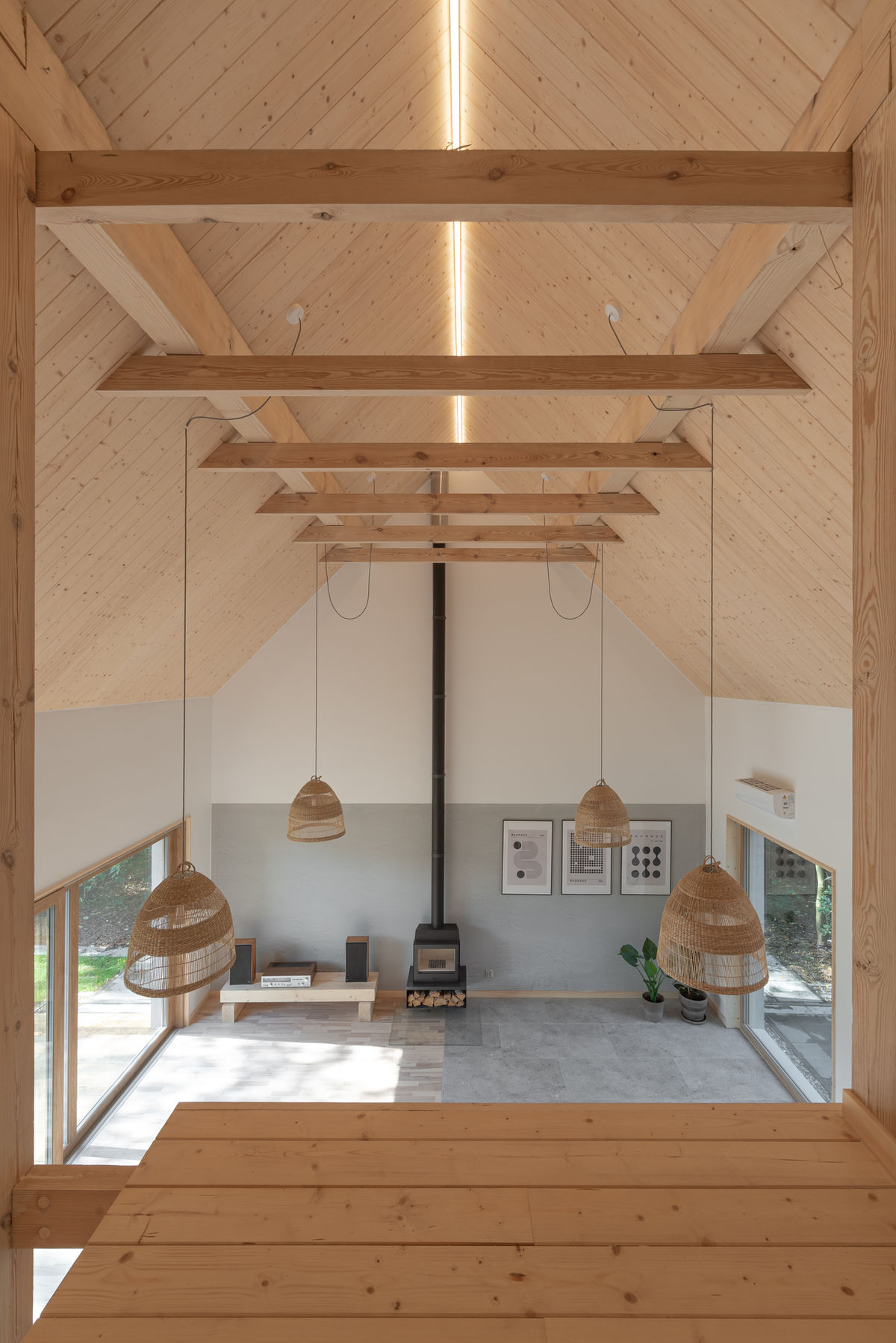 Układ funkcjonalny domu zaplanowany został w przestrzeni parteru budynku. Otwarty salon z aneksem kuchennym oraz designerskimi drewnianymi schodami to miejsce relaksu, przyjmowania gości oraz całodziennego funkcjonowania. Wygodne schowki, pomieszczenia gospodarcze oraz garderoby zostały dyskretnie pochowane w głębi domu. Na parterze zaprojektowano też główną sypialnię oraz w sąsiedztwie minimalistyczną łazienkę. Ściana z przeszkleniem otwiera widok z łóżka na zieleń w ogrodzie. Można bezpośrednio wyjść na trawnik i cieszyć się śniadaniem wśród śpiewu ptaków. Uzupełnieniem strefy dziennej jest antresola oraz dwa wydzielone pomieszczenia na poddaszu.